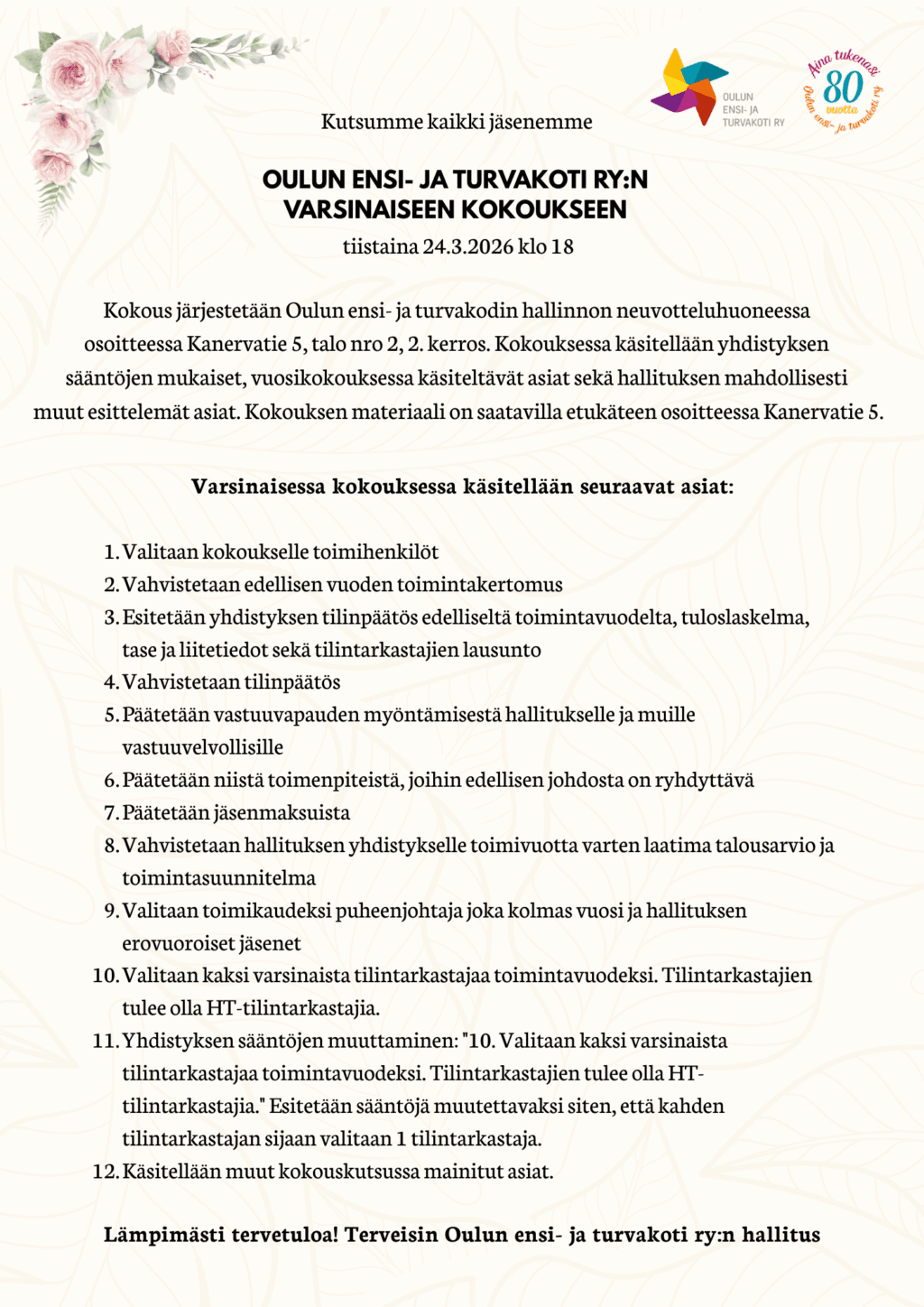 Kutsumme kaikki jäsenemme Oulun ensi- ja turvakoti ry:n varsinaiseen kokoukseen tiistaina 24.3.2026 klo 18. Kokous järjestetään Oulun ensi- ja turvakodin hallinnon neuvotteluhuoneessa osoitteessa Kanervatie 5, talo nro 2, 2. kerros.